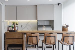 Na parte da varanda, a arquiteta optou por substituir a churrasqueira a carvão por um modelo à gás, que está em alta devido à praticidade e beleza. A parede e abancada são de Sinth, material inovador que imita mármore, tem alta resistência ao calor, riscos e manchas. Já a marcenaria recebeu pintura de microtextura cinza clara. Para curtir o churrasco ali mesmo, Roberta também previu uma bancada de madeira de demolição, acompanhada de duas banquetas e lugar para a adega | Foto: Thiago Travesso