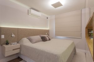 Na suíte do casal, a ideia for manter o mesmo layout, porém os moradores ganharam novos armários e móvel em frente à cama. Destaque para a cabeceira estofada, acompanha de novos apoios laterais suspensos revestidos de laca brilhante cinza e com puxadores embutidos de cobre. No lavabo, o Sinth, mesma pedra da churrasqueira, compôs a bancada, enquanto as paredes trazem papel de parede texturizado | Fotos: Thiago Travesso