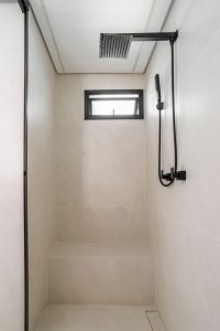 Na área do box desse banheiro executado pelo arquiteto Bruno Moraes, a versatilidade e o estilo clean do porcelanato especificado revestiram tanto parede e piso, como delinearam o ralo linear, nicho e o banco. O tom claro aparece como contraponto aos detalhes pretos da esquadria e dos metais | Projeto: BMA Studio | Foto: Guilherme Pucci