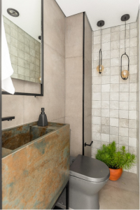 Neste lavabo assinado pelo arquiteto Bruno Moraes, o apelo rústico do aço corten marca presença na banca com cuba esculpida. No piso e parede, a predominância do revestimento que remete ao efeito de cimento queimado | Projeto: BMA Studio | Foto: Guilherme Pucci