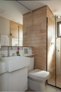 As faces amadeiradas na zona do box são um modelo de porcelanato que chega a ser confundido com o revestimento de madeira natural | Projeto: BMA Studio | Foto: Luis Gomes
