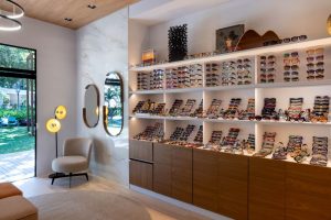 Um exemplo é a ótica, criada para mostra pelo arquiteto Sergio Novaes. No local, os expositores destacam as peças da Gustavo Eyewear. Nos revestimentos, o profissional optou pelas lastras Apuan, da Portinari, e com elas criou um painel, localizado logo na entrada da loja, onde ficam os espelhos para os clientes provarem os óculos. Os produtos, em mega formato 160×320, são inspirados nos mármores dos Alpes Apuanos, na Itália, e se destacam pela beleza e contraste entre as peças.