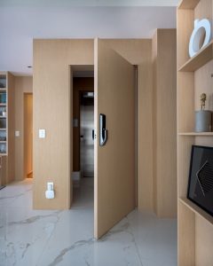 Ainda segundo a arquiteta, outro benefício deste modelo de porta está na possibilidade de personalização e criação de vãos de abertura maiores. “Além de adicionar um ar moderno ao ambiente, ela responde quando desejamos um efeito mimetizado. Eu adoro quando ela se ‘camufla’ com o painel“, afirma a arquiteta. Um outro proveito destacado pela arquiteta diz respeito à maior segurança que a porta proporciona, bem como o menor risco de empenamento com o passar do tempo.