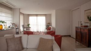 Trazendo uma proposta atual e mais moderna para o décor, Carina projetou a porta pivotante deste living, aumentando a sua largura durante os momentos de reforma do lar. Desta forma, a arquiteta mostra que é possível trazer este modelo de porta até para ambientes mais compactos, como é o caso dos apartamentos | Foto: Luís Gomes