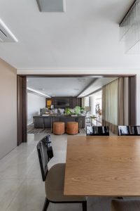 No projeto executado escritório Patrícia Penna Arquitetura & Design, a porta de madeira com duas folhas separa a cozinha da sala de estar, sem abrir mão da elegância e sofisticação. O tom escurecido da madeira destaca ainda mais personalidade ao projeto executado com maestria, garantindo uma porta que combina tanto a sala de estar, quanto com a cozinha | FOTO: Leandro Moraes