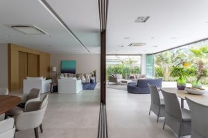 Com uma mecânica fácil para abrir a porta, os trilhos foram instalados na parte superior e, quando aberta, uma espécie de pórtico convida os moradores e visitantes à uma circulação fluida graças a integração otimizada entre os espaços | Projeto: Patrícia Penna Arquitetura & Design | FOTO: Leandro Moraes