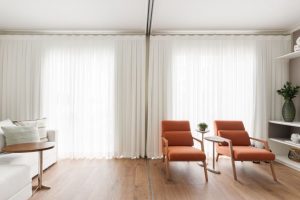 Os trilhos podem ser executados de maneira discreta, como nesse projeto realizado pela arquiteta Daniela Funari. A fina linha do trilho não destoa na decoração e ainda dividiu de maneira igual o ambiente, que ainda ganha ainda portas de vidros para a área externa da residência | FOTO: Julia Novoa