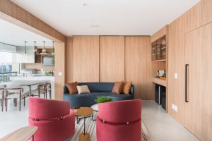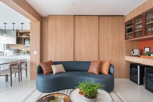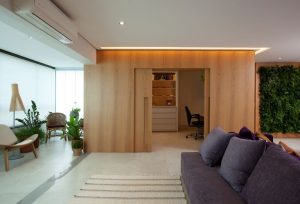 Separando o home office da área social deste apartamento, a porta embutida projetada pelas arquitetas do Studio Tan-gram ganhou um painel de madeira e conferiu toda a privacidade necessária ao ambiente de trabalho | FOTO: Luis Gomes