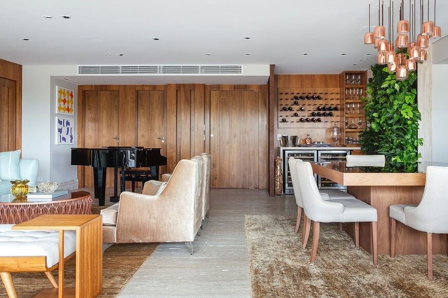 Neste projeto assinado pelas arquitetas Paula e Danielle, a porta mimetizada ‘desaparece’ no projeto. E o que ela ‘esconde’? Logo atrás está localizada a copa, que pode ser unificada com a sala de jantar ou trazer privacidade na hora das refeições | Fotos: Maura Mello