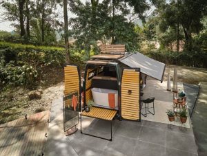 Já na CASACOR MG, o Motorhome, assinado pelos arquitetos Silvio Todeschi e Marcos Guimarães, mostrou que a aventura começa antes da viagem. O deck vira uma espreguiçadeira no teto e tem até uma banheira encaixada embaixo do sofá/cama. O porcelanato Audaz conferiu leveza e charme ao espaço externo! Inspirado nas pedras vulcânicas, ele é uma das novidades da Expo Revestir 2022 que recebeu o novo tratamento antiderrapante.