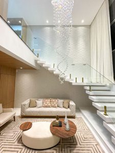 O projeto foi executado no Residencial IL, localizado na cidade de Patos, sertão da Paraíba. O ambiente tem 33 m² com pé direito duplo e o arquiteto conta que os moradores buscavam por uma proposta moderna, com amplitude de pé direito, mas sem perder o aconchego e o ritmo presentes nos demais locais da residência.