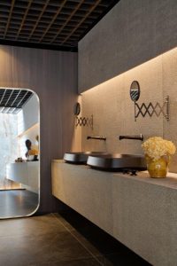 A coleção escolhida pelo arquiteto é uma fusão da pedra com o cimento originando a coleção Cement Stone. Com a aparência desgastada, as peças possuem cores e veios modernos, formando uma base neutra repleta de personalidade e sofisticação.