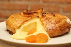 Queijo Brie: peça de queijo brie assado envolto em massa folhada e geleia de damasco