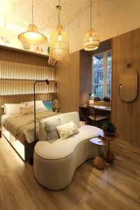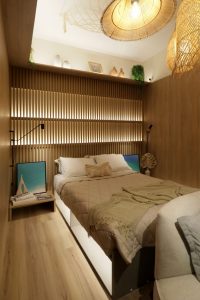 No quarto Brisa Potiguar, a profissional desenvolveu junto a marcenaria artesanal Predilecta, um amplo painel ripado que transmite a ideia de movimento, vento suave e de horizonte, com uma leve iluminação.