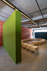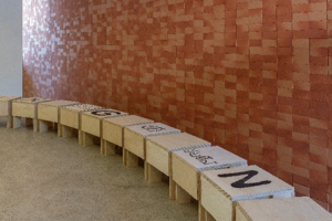 O arquiteto Felipe Soares projetou um espaço cenográfico para palestras e bate-papos a partir de uma proposta cuidadosa, que mostra um pouco dessa atenção aos detalhes e à qualidade da TerraTile que, com este ambiente, celebra seus 40 anos de mercado. Da arquibancada em ladrilho azul à presença da cerâmica crua da Lepri na parede e de bancos com assentos com algumas estampas produzidas pela empresa de artistas conhecidos. Os bancos, que são de uma simplicidade absurda e poderiam passar batido. Só que não. Foram inspirados no trabalho do designer e artista italiano Enzo Mari, famoso por sua fúria.