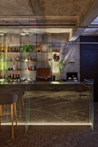 Para o balcão projetaram uma base em pedra, ortogonal, que abriga os equipamentos do bar. Sobre o balcão de pedra há uma casca de vidro que permite que os visitantes se assentem e compartilhem dessa experiência estando mais próximos da operação. Atrás do balcão, uma estante de vidro comporta os copos, taças e os utensílios do bar.