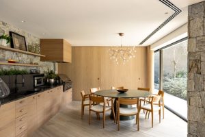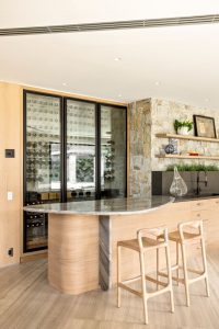 O sofa pedra no meio do living cria espaços que convindam os visitantes a momentos de bate papo e descontração. Aliás este foi um pedido do cliente que gosta de receber familiares e amigos. Ele queria ambientes para receber os convidados de forma descontraída. Ele gosta de cozinhar por isso ao lado da sala de jantar criamos uma cozinha gourmet onde ele pode cozinhar enquanto interage com os convidados. Este ambiente fica totalmente integrado com a sala de jantar quando as portas de correr estão abertas.