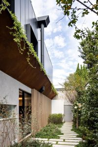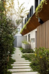 O telhado em chapas metalicas foi um grande desafio pois apesar de existir bastante na Europa e USA, não tínhamos aqui no Brasil ninguém que fizesse. Então juntamente com a construtora e um telhadista desenvolvemos o material. O jardim mediterrâneo foi um pedido do cliente e que foi super bem acolhida pois conversava totalmente com a linguagem da casa. O paisagismo foi então entregue ao Rodrigo Oliveira que criou este jardim especialmente para o projeto. Ele foi no sul buscar enormes oliveiras que ficam em destaque ao longo da raia.