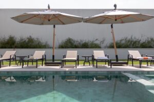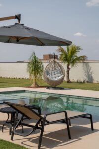 A área externa deste projeto revela-se como um verdadeiro oásis de tranquilidade e elegância, onde uma ampla piscina se destaca como o coração do espaço, rodeada por espreguiçadeiras convidativas. A presença de um balanço ninho, estrategicamente posicionado, adiciona um toque de aconchego e diversão, criando um ambiente prazeroso e acolhedor. O paisagismo intimista, cautelosamente planejado, envolve toda a área com uma vegetação delicada, conferindo suavidade e leveza ao conjunto. O mobiliário náutico, com sua estética casual e sofisticada, complementa a proposta, proporcionando conforto, enquanto o gazebo acolhedor se torna um refúgio perfeito para desfrutar do clima ameno da região.