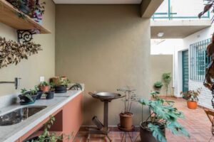 Um dos maiores destaques do projeto é a área externa, que se transforma em um verdadeiro oásis de tranquilidade. No fundo do terreno, foi construído um rancho que divide-se em diferentes ambientes, cada um com sua função específica. O espaço foi idealizado para que a família pudesse desfrutar de momentos de lazer juntos, seja assando pães fresquinhos, cuidando das plantas ou simplesmente brincando ao ar livre. Este rancho, mais do que uma construção, representa um convite à convivência e ao simples prazer de estar em contato com a natureza.