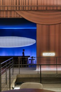 Na cortina do palco, o veludo deu lugar a uma intervenção em painéis metálicos, fornecidos pela Gerdau, que foram perfurados em círculos com corte a laser de tamanhos variados, criando um efeito tridimensional. Em tom mais escuro que a parede, a passadeira central, assinada pela artista Rita Lessa atravessa todo o ambiente, que possui cerca de 26m de comprimento. Nivelados, o piso do tablado e do palco tem a mesma altura, exceto as duas áreas destinadas às apresentações musicais, onde estão dispostos os instrumentos fornecidos pela Serenata que serão utilizados nas apresentações, como piano, violoncelo e saxofone, presentes no ambiente, justificando o nome ao restaurante.