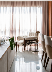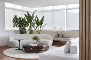 Partindo da premissa de que a base clara traz amplitude e luminosidade aos ambientes, a arquiteta Juliana Cascaes optou pelo branco nos principais pontos assumindo total protagonismo. No apartamento de 140m² a paleta clara, distribuída entre paredes, cortinas, mobiliário e revestimentos, amplia a percepção de espaço e reforça a sensação de leveza que envolve todo o ambiente. Na reforma, Juliana integrou a varada, e usou o piso em mármore polido que reflete a luz natural e invade o espaço pelas amplas cortinas translúcidas, intensificando o brilho e a fluidez da composição. Para dar alguns ponto de calor, usou a madeira presente nos detalhes do mobiliário e paines, além da presença marcante das plantas, que adicionam frescor e vida ao conjunto. O resultado traduz a neutralidade do branco, que se transforma em um convite ao conforto, à calma e ao bem-estar.