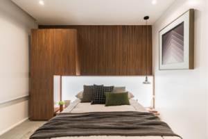 Neste quarto projetado pela DB Barros Interiores, o branco funciona como ponto de partida para uma leitura contemporânea e acolhedora da decoração — um diálogo que conversa diretamente com a proposta da Pantone para 2026, marcada pela leveza e pela atmosfera suave de Cloud Dancer. As arquitetas exploram o poder do branco não apenas nas paredes, mas também como suporte visual para destacar texturas, volumes e a paleta quente da madeira. O grande destaque é a tela tensionada atrás da cama: quando acesa, irradia um brilho cálido que envolve o espaço em uma sensação de conforto imediato; quando apagada, atua como uma superfície complementar, discreta e elegante, reforçando a estética minimalista. O painel ripado em madeira agrega profundidade e equilíbrio térmico ao ambiente, enquanto os detalhes — como luminárias pontuais, roupa de cama em tons terrosos e almofadas de diferentes texturas — completam a composição com harmonia.