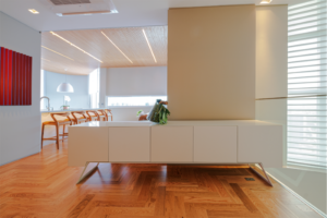No duplex de 320 m², o arquiteto Jayme Bernardo traduziu com precisão o desejo de um jovem casal com dois filhos: criar um refúgio urbano que refletisse sua personalidade e valorizasse a vista privilegiada do apartamento, onde é possível enxergar os limites da cidade. Banhado por luz natural, o projeto abraça a vocação ensolarada do espaço e ganha uma atmosfera leve, elegante e acolhedora. A decoração segue uma linha contemporânea, com tons neutros e claros que ampliam a sensação de tranquilidade — uma paleta pensada para inspirar calma e harmonizar a rotina familiar. Em equilíbrio com essa suavidade, surgem painéis de madeira em carvalho americano, ora lisos, ora ripados, que aquecem a composição e criam pontos de sofisticação sem pesar no visual. Entre os destaques do ambiente está o buffet assinado pelo próprio Jayme Bernardo, peça desenvolvida para sua marca de mobiliário, a DIEEDRO. O desenho autoral reforça o caráter exclusivo do projeto e dialoga com toda a estética do apartamento, unindo funcionalidade, design e identidade em um único elemento.