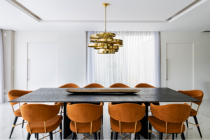 Esta sala de jantar projetada pela arquiteta Fernanda Rubatino as paredes brancas e o piso em tons neutros criam uma base contínua, permitindo que a luz natural se espalhe com suavidade e amplifique a sensação de leveza. Esse fundo luminoso funciona como uma tela em branco onde cada escolha de mobiliário ganha protagonismo. Os pontos de cor entram em cena de forma estratégica, especialmente nas cadeiras em tom terracota — quentes, vibrantes e acolhedoras, elas criam um contraste elegante sem romper a harmonia visual. O efeito é contemporâneo e equilibrado: a cor aparece como acento, trazendo personalidade sem pesar a composição. Entre a clareza predominante, os detalhes cuidadosamente escolhidos e os materiais nobres, Fernanda Rubatino constrói um ambiente que combina frescor, elegância e presença.