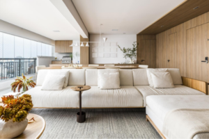 O apartamento de 167 m², assinado por Ticiane Lima para um casal com um filho pequeno, recebeu uma reforma completa que integrou living, sala de jantar e área gourmet, além de transformar uma das suítes em brinquedoteca. Com rotina híbrida e intensa, os moradores buscavam praticidade e um layout que facilitasse a dinâmica familiar, resultando em uma atmosfera minimalista, clean e contemporânea. Os tons claros que permeiam o projeto, especialmente o branco suave que ecoa o tom Cloud Dancer, Cor do Ano 2026 da Pantone, dialogam com a madeira clara e o porcelanato de aspecto cimento queimado, criando unidade visual em todos os ambientes.