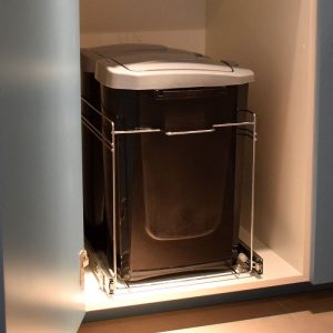 Para quem não gosta de ver a lixeira exposta na cozinha, a melhor opção é um modelo embutido dentro do móvel – geralmente a bancada da pia. Esse truque é indicado para quem tem mais espaço, pois parte do mobiliário será dedicada a acomodar o acessório. Um modelo bastante completo e eficiente é a lixeira embutida dupla com corrediça telescópica e tampa articulada assinada pela Masutti Copat, assim o usuário tem mais praticidade para descartar lixo orgânico e reciclável em um só lugar (assista ao vídeo e saiba como funciona).