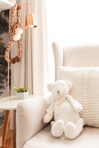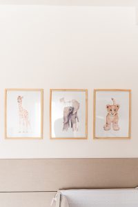 Partindo do tema escolhido, a arquiteta desenvolveu, junto a Primeiro Plano, um adesivo de parede especialmente para este projeto. As árvores desenhadas nas parede deram vida ao ambiente, que tem móveis e itens de decoração numa paleta mais neutra, como o tapete e a poltrona. Três gravuras de filhotes de animais selvagens completam o clima Safari, junto aos bichinhos de pelúcia.
