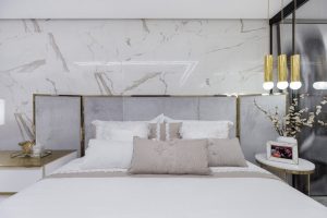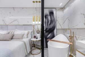 Projeto da arquiteta Renata Marques – Coleção Duomo Portinari revestindo paredes e pavimento do quarto e banheiro integrado