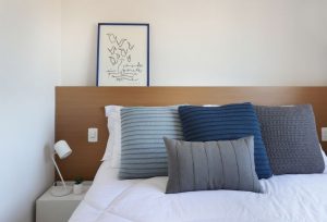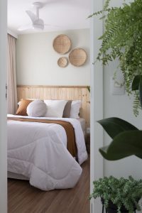 No quarto principal do #apêmacramê, assim como em todo o projeto, o escritório focou em tons e elementos naturais, para que cada pedacinho do espaço pudesse trazer conforto e acolhimento. Apesar de pequeno o ambiente é repleto de peças que trazem reconhecimento aos moradores, foi o casal quem fez a cabeceira da cama, em madeira natural ripada. Não à toa a peça é o grande charme do ambiente.