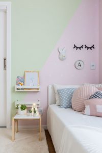 A pintura geométrica em cores pasteis deixa o quarto da pequena Amanda, do #apêararaazul, alegre sem ficar cansativo com o tempo. Ela ainda ganhou um mini-camarim para dar vida à sua fantasia de princesa