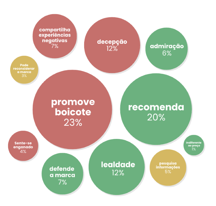 Ao mapear a jornada emocional do consumidor, a Orbit dividiu os perfis em cinco estágios: 28% estão em plena desconfiança (boicotam e denunciam); 19% tiveram a confiança abalada por experiências negativas; 10% permanecem indecisos; 30% têm confiança conquistada após boas experiências; e 13% expressam plena confiança, atuando como promotores das marcas nas redes.