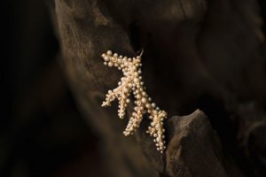 Transcendendo as fronteiras entre as artes visuais e a joalheria, a escultura evoluiu para uma joia, na qual as verdadeiras pérolas são protagonistas, encapsulando a essência da obra original. “Raízes Aquáticas” como joia é não apenas um adorno de sublime beleza, mas também um símbolo potente de conexão, pureza e reverência ao feminino e às raízes que nos definem.