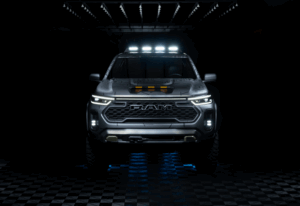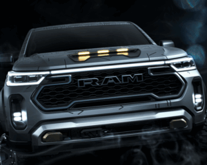 Na dianteira também está presente um capô esportivo com entrada de ar superior iluminada por três pontos de luz laranja, uma referência e homenagem à algumas das picapes mais famosas da história da Ram. No para-choque, gancho de reboque frontal, guincho elétrico e protetor inferior reforçam a capacidade e robustez presente em todas as picapes da marca, adornados por elementos pintados em um exclusivo tom bronze.