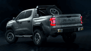 O estilo único da Dakota Nightfall Concept continua na traseira, onde se destaca o estepe aparente e integral. Ele é fixado em um Rambar exclusivo, que também adota potentes luzes de led de longo alcance, outro diferencial para os mais diferentes desafios no campo e fora de estrada. Outros destaques da traseira são as marcantes lanternas também de led e o emblema Ram na tampa traseira, além do para-choque traseiro com ganchos de reboque.
