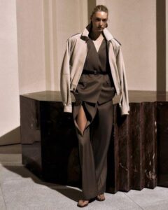 Compondo a estética minimalista, os tons neutros e terrosos, como off white, oliva, mascavo, preto e taupe, constroem a base da paleta, que conta com alguns pontos de cor estratégicos, como o light blue, e estampas como paisley e maxi poá.