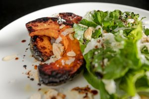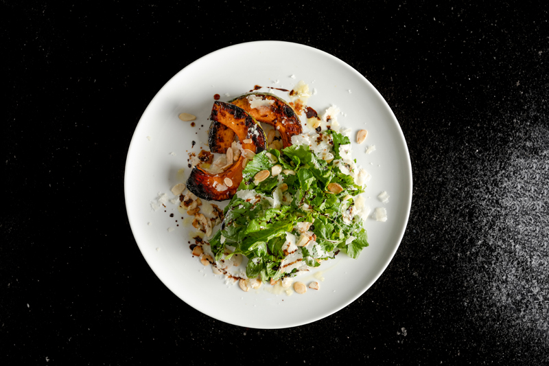 Lave as rúculas, disponha-as no prato, arrume as abóboras ainda mornas por cima, tempere com azeite, sal à gosto e aceto balsâmico. Finalize com as amêndoas laminadas torradas na frigideira e lascas de queijo da Serra da Canastra.