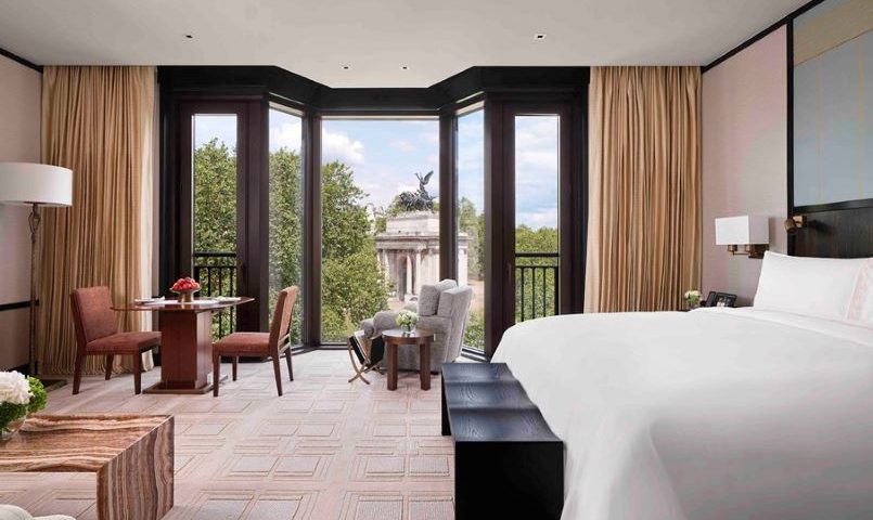 Os 190 quartos e suítes, minuciosamente projetados pelo renomado arquiteto e designer de interiores Peter Marino, possuem janelas do chão ao teto com vista para a arquitetura histórica do distrito que o circunda, como as inigualáveis Wellington Arch e a histórica Belgravia. Os quartos apresentam móveis sob medida, tecidos e obras de arte que evocam a sensação de residências particulares sofisticadas. Todos incluem vestiários revestidos de mogno, banheiros revestidos de ônix mel e acessórios personalizados, fabricados por renomados artesãos britânicos.