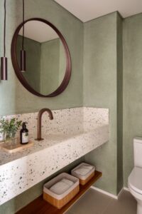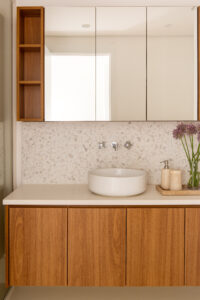 No banheiro da suíte master, o destaque é o frontão em granilite, enquanto o segundo lavabo ganhou um toque mais lúdico, sem perder a atemporalidade.
