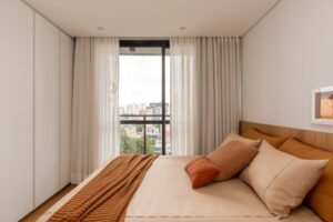 Outro destaque do projeto é a posição da cama no quarto do casal. Voltada para a vista externa, sua disposição precisou contornar um recorte da fachada. A solução veio com um desenho especial de marcenaria, onde as mesas de cabeceira passam por baixo da cama, criando um efeito contínuo e harmônico.