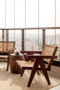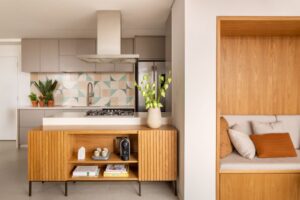 Para valorizar a área social, a lavanderia foi reduzida, permitindo a criação de um sofá embutido em marcenaria, estrategicamente posicionado para aproveitar a vista privilegiada para a Praça do Pôr do Sol, na Zona Oeste de São Paulo. “Cada solução foi pensada para equilibrar funcionalidade e aconchego, garantindo que os espaços dialogassem com a rotina e os desejos dos moradores”, comenta a arquiteta Paula Warchavchik.
