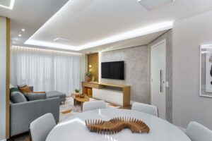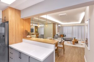 A cozinha ganhou uma bancada em quartzo branco, ideal para refeições rápidas e atividades do dia a dia, enquanto a cristaleira multifuncional também funciona como adega. No living, os móveis planejados e o gesso modernizado criam uma atmosfera acolhedora e sofisticada, perfeita para receber amigos e familiares.