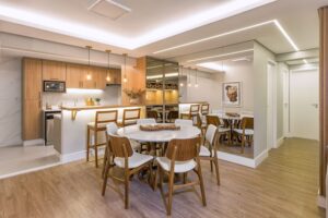 Durante uma reforma, que levou sete meses para ser concluída, o layout foi modificado para criar um ambiente integrado entre a sala de jantar, a cozinha e o living. A madeira, representada pelo MDF Itapuã, desempenha um papel de destaque no projeto, imprimindo aconchego e sofisticação, enquanto o MDF Gianduia e os revestimentos de alto padrão, como o Caravaggio 61×120, garantem um contraste elegante e uma linguagem contemporânea.