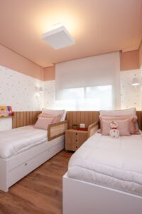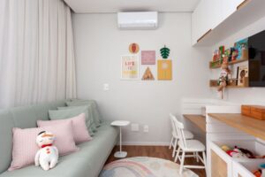 O antigo quarto de serviço virou um home office compacto e funcional, com acesso direto pela sala — solução prática para o trabalho remoto. Já no universo infantil, o novo layout do quarto das meninas priorizou conforto, segurança e ludicidade, com camas sob medida, teto colorido, adesivos e quadrinhos. O segundo quarto foi convertido em brinquedoteca versátil, equipada com sofá-cama, mesas evolutivas e nichos acessíveis.