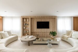 O projeto privilegia a integração dos espaços sociais, criando uma fluidez entre o living, a sala de jantar, o espaço gourmet e a varanda. A sala de estar e jantar, conta com sofás curvos na cor branca, que contrastam elegantemente com o painel de TV revestido em mármore travertino e com nichos em prateleiras de vidro.