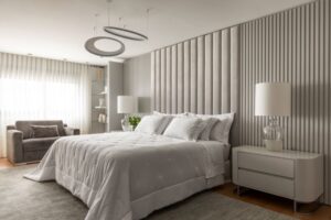 A suíte master, com impressionantes 100m², é o grande destaque do imóvel. O ambiente foi planejado com armários e painéis em laca cinza-claro, combinando perfeitamente com o piso de madeira Tauari, criando um espaço que é ao mesmo tempo funcional e esteticamente agradável. A suíte conta ainda com dois closets e dois banheiros separados, atendendo à necessidade de privacidade e organização do casal. Por outro lado, a sala de TV íntima e o quarto dos netos são ambientes que mesclam conforto e diversão, pensados para momentos de lazer e convívio familiar.